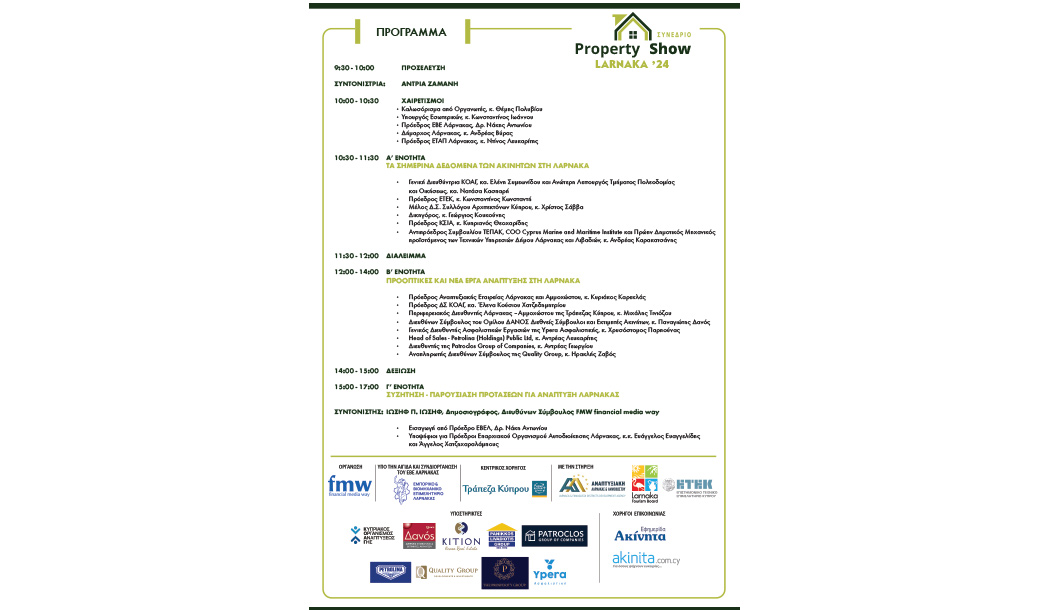 Το Εμπορικό και Βιομηχανικό Επιμελητήριο Λάρνακας τελεί υπό την αιγίδα του το 6ο Property Show Larnaka ‘24 με θέμα «Η Επόμενη μέρα για την Ανάπτυξη της Λάρνακας». Το Συνέδριο οργανώνεται από την εταιρεία FMW με τη στήριξη της Εταιρείας Τουριστικής Ανάπτυξης (ΕΤΑΠ) Λάρνακας, την Αναπτυξιακή Εταιρεία Λάρνακας – Αμμοχώστου, και του ΕΤΕΚ και θα πραγματοποιηθεί την Παρασκευή 26 Απριλίου και ώρα 10:00 – 17:00 στο ξενοδοχείο Radisson Blu στη Λάρνακα.